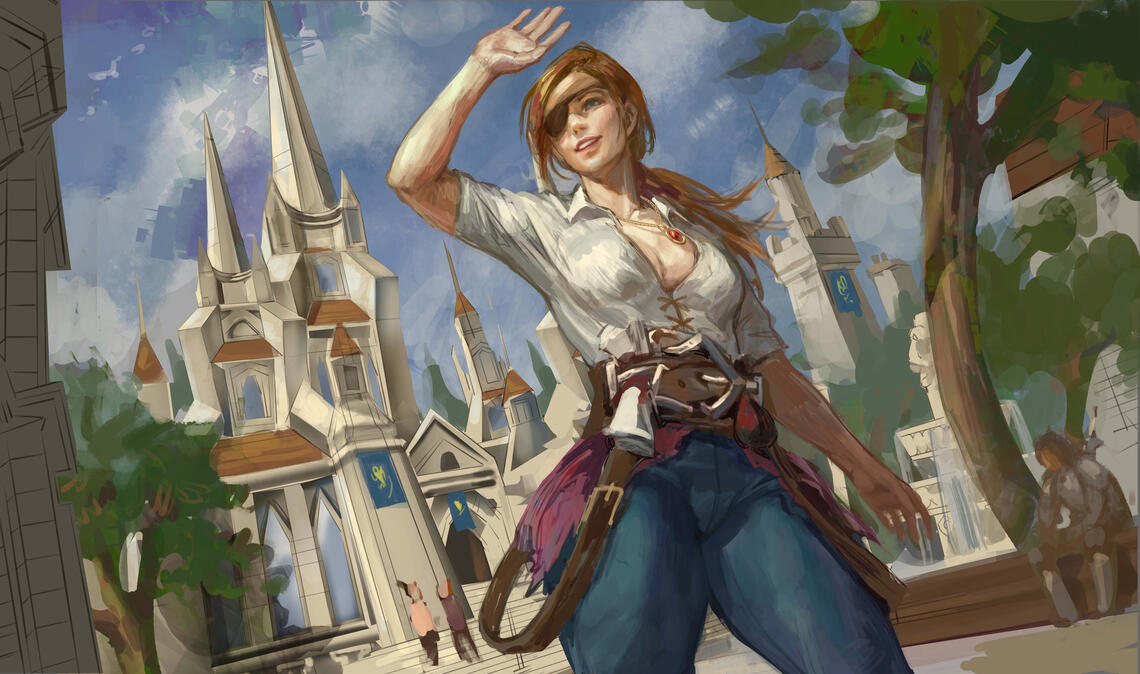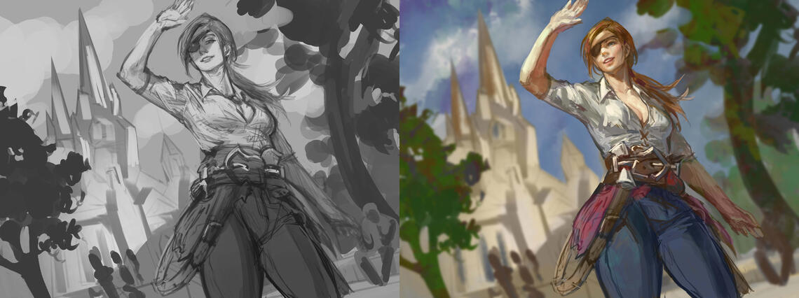 Based on your references, I will create a black and white sketch. At this stage, you’re welcome to request any corrections or adjustments to the pose, design, and other details until we finalize the sketchOnce the sketch is complete, I will add rough colors for the character and environment. I’ll send this version for your approval to ensure you’re satisfied with the color choices